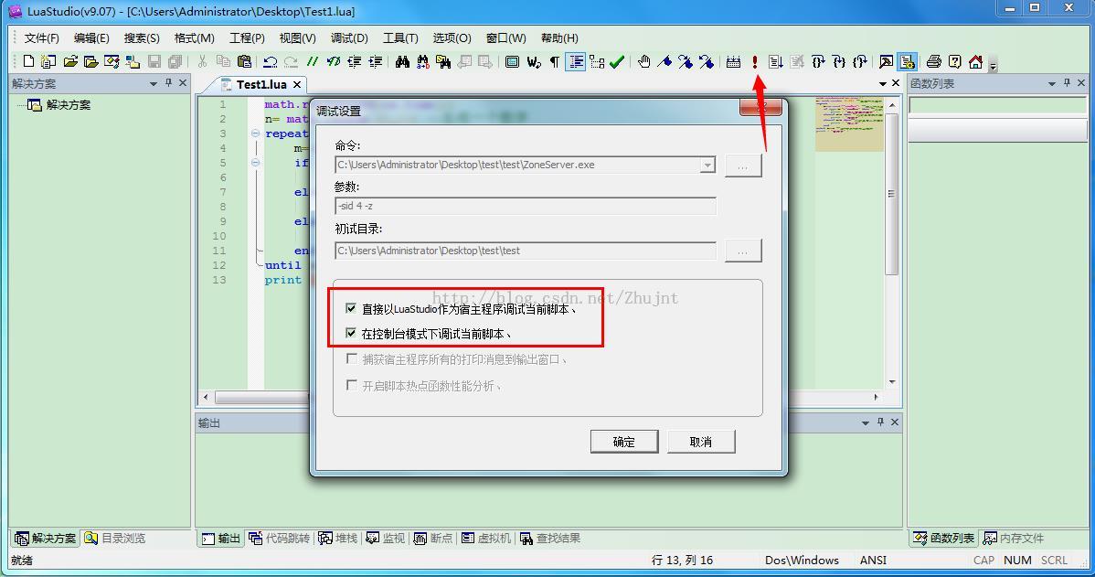 如图:由于代码中使用了io.read("*number")、所以需要我们开启控制台模式调试、这样就可以输入数字了!!!